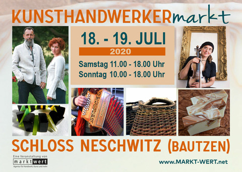 Am 18.07.2020 von 11-18 Uhr und am 19.07.2020 von 10-18 Uhr findet der Kunsthandwerkermarkt in der Parkanlage Neschwitz statt. Dort präsentieren zahlreiche Aussteller feinstes Kunsthandwerk und freuen sich auf Ihren Besuch.