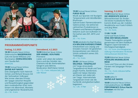 Für ein Festival, das auf einmalige Weise Stimmen und Stimmungen vereint, kommen Anfang Februar 2023 für drei Tage wieder hochkarätige Musiker*innen und Sänger*innen nach Bad Muskau. Geboten werden in verschiedenen Räumlichkeiten des Neuen Schlosses Opernaufführungen mit der Serkowitzer Volksoper, virtuose Konzerte, ein Chansonabend, spanische Klänge und zum Mittanzen eine Tango-Milonga. Auch musikalische Formate für Kinder sind nicht vergessen.